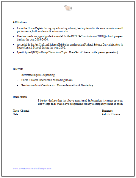 Put your written statement at the bottom of the resume ie. Here is a list of thing you must keep in mind while writing your declaration in resume for freshers. As the declaration does not contain more than one or two lines it should be written at the bottom of the resume.