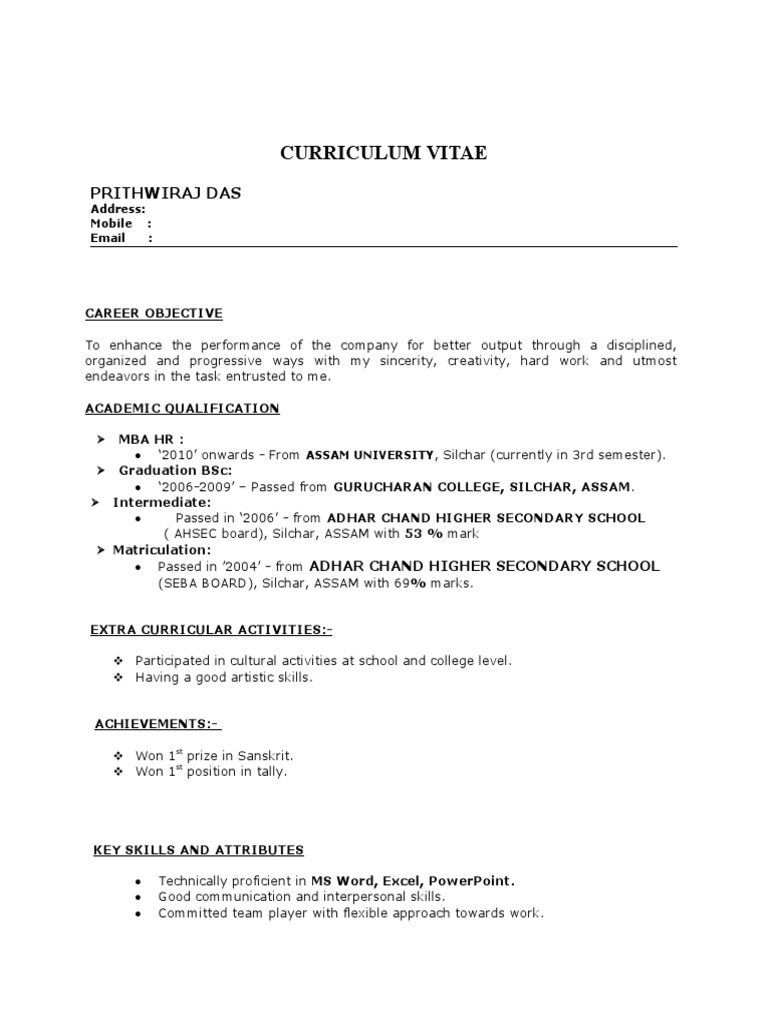 Resume -Free Resume Format for Freshers MBA HR - Samples of resume or biodata or Curriculum Vitae CV format of resume for Bca freshers.