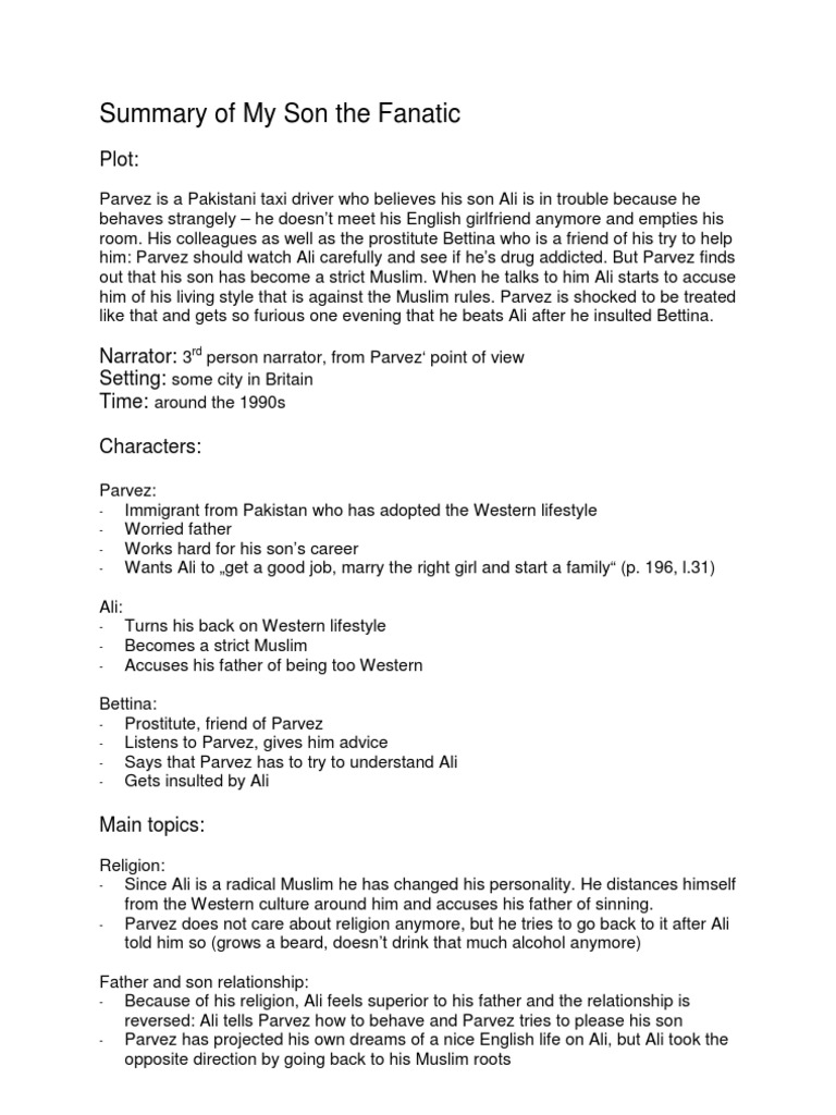 Summary of My Son the Fanatic. His son Ali is a college student in England. Summary My Son the Fanatic by Hanif Kureishi begins with a description of a father who sneaks into his sons bedroom.
