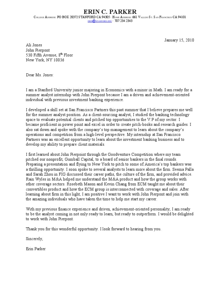 Sample Cover Letter For Investment Banking Internship