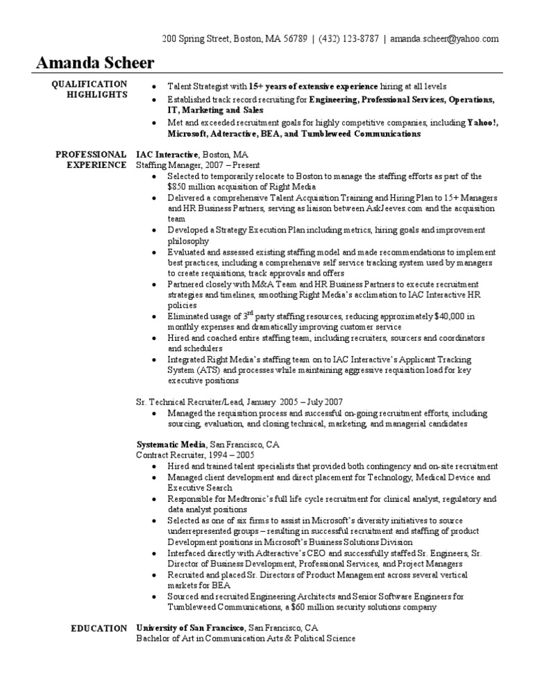 Staffing Recruiter Resume Sample. Dynamic recruiter with over 20 years of hands-on recruitment and management experience in militarygovernment and corporate settings Innovative problem solver with a solid and driven work ethic Active Secret Government Security Clearance Demonstrable record of success in every positionassignment. Staffing Recruiters or Staffing Specialists find potential job candidates by attending career fairs reviewing resumes and posting ads. Staffing Recruiter Resume Example.